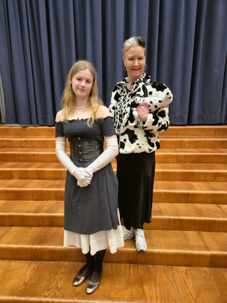 Our student Maire Hakala dressed up as Feyre, the High Lady of the Night Court, from the book series A Court of Thorns and Roses, while Riikka dressed up as Cruella de Vil from The Hundred and One Dalmatians.