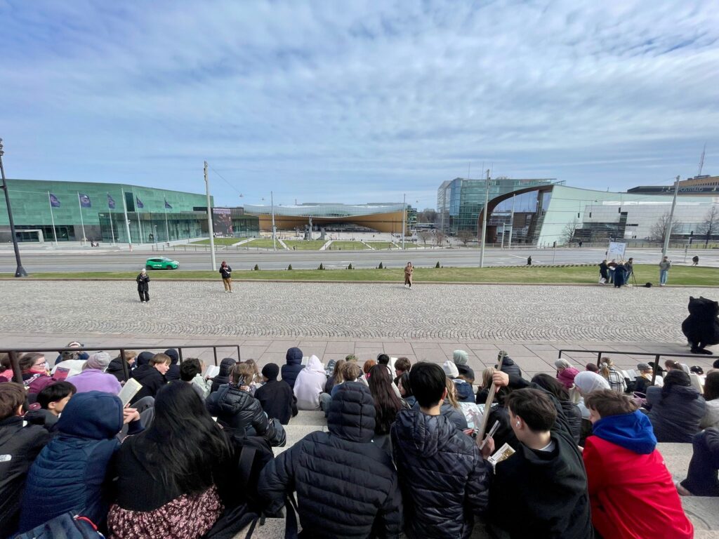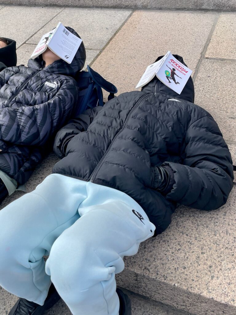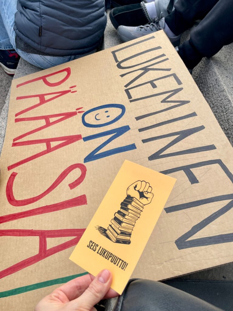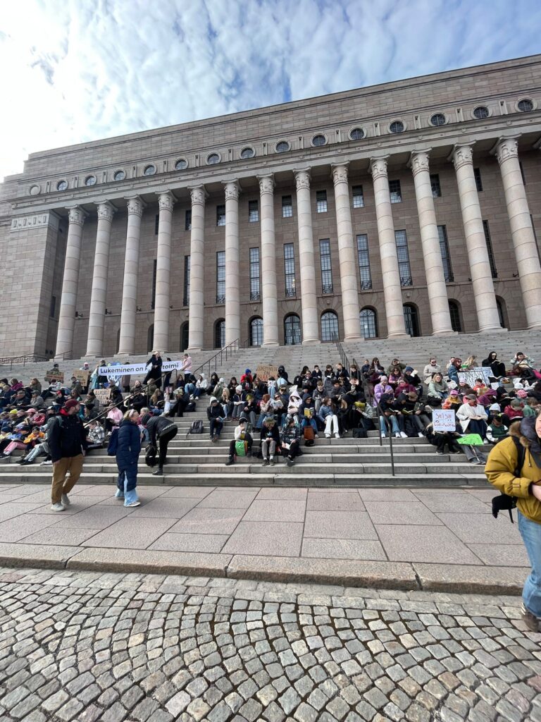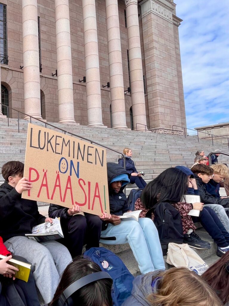 Joukko Kulosaaren yhteiskoulun 7.luokkalaisia kävi torstaina äidinkielen ja kirjallisuuden tunnilla osallistumassa Seis lukupuutto -mielenilmaukseen, eli lukemassa tunnin ajan Eduskuntatalon portailla. Sää oli vähän viileä, mutta portaat täynnä lukijoita.