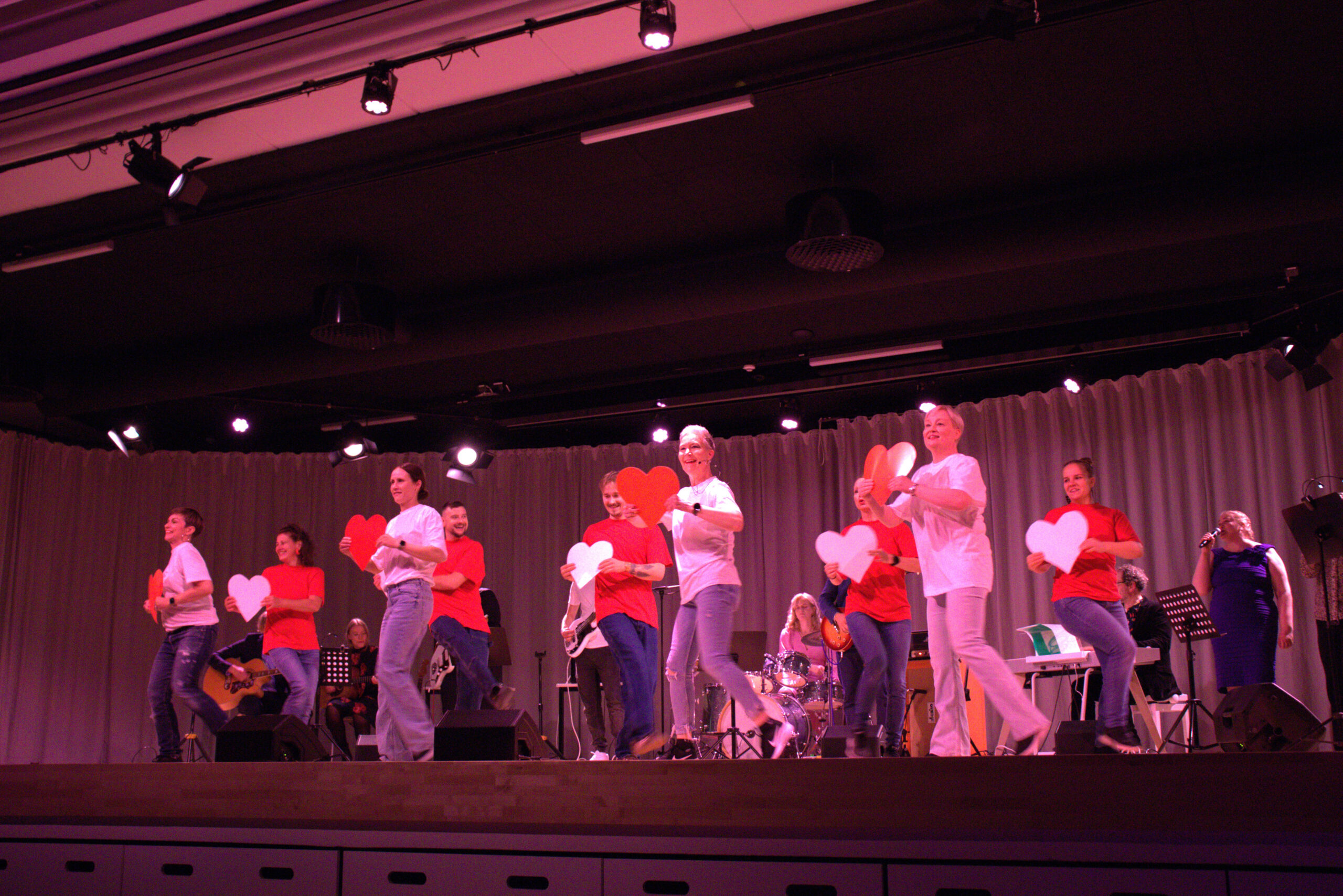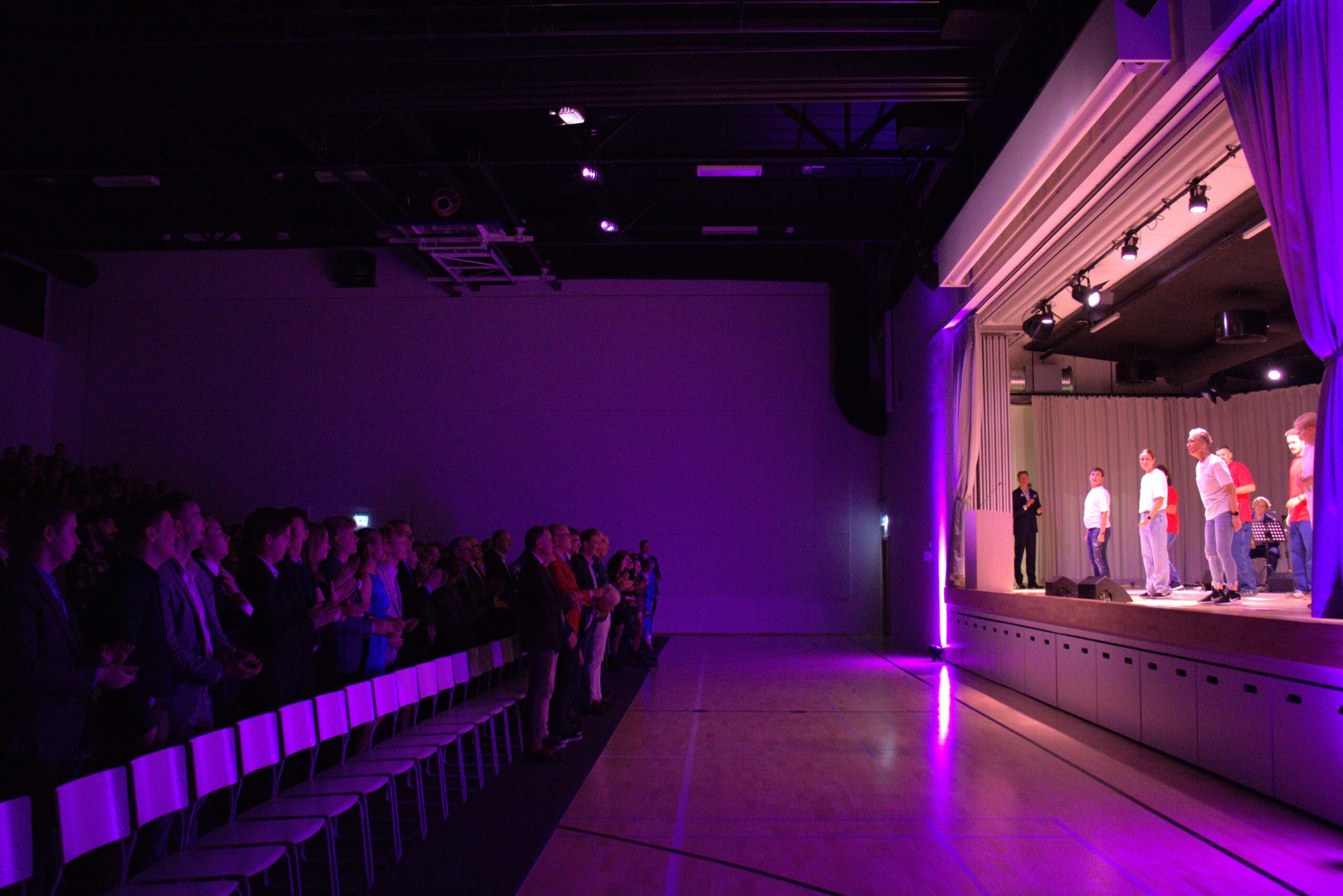 Lukiomme opiskelijat kajauttivat kaksikielisen koulumme kunniaksi onnittelulaulun, suomeksi ja englanniksi.