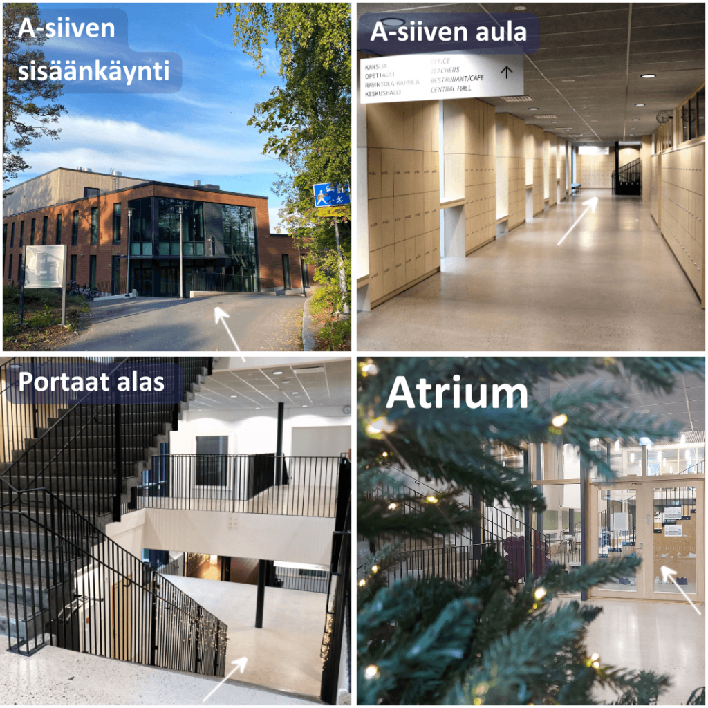 Löydät paikalle helpoiten, kun saavut metroaseman suunnasta A-siiven sisäänkäynnistä (kts. kuva alla).