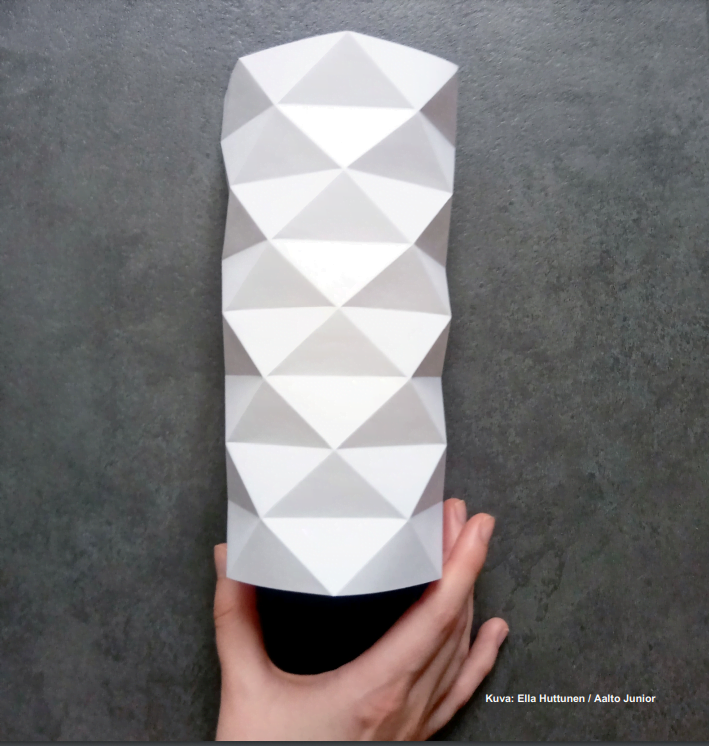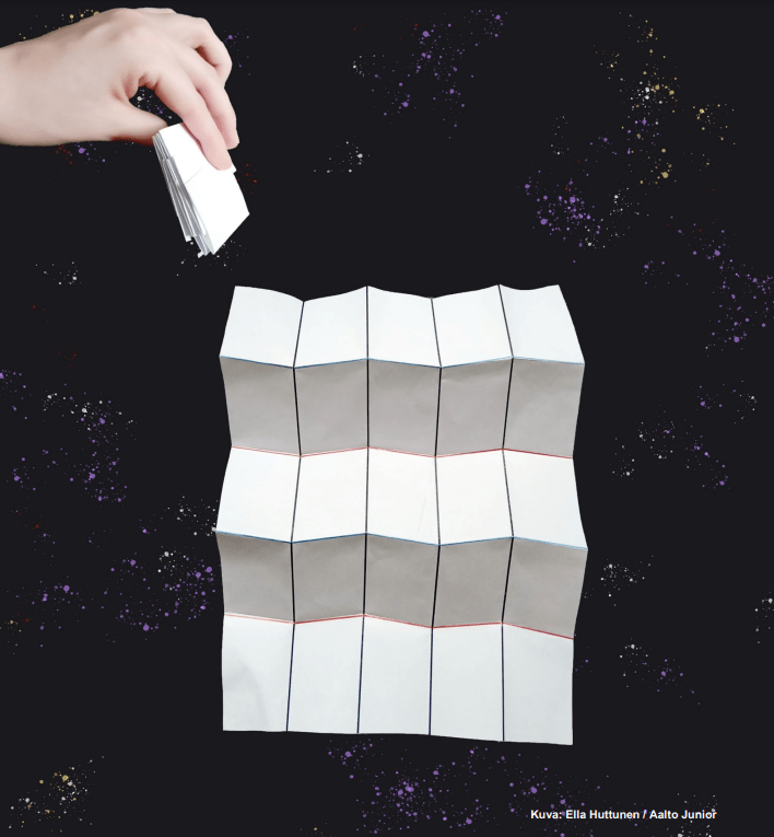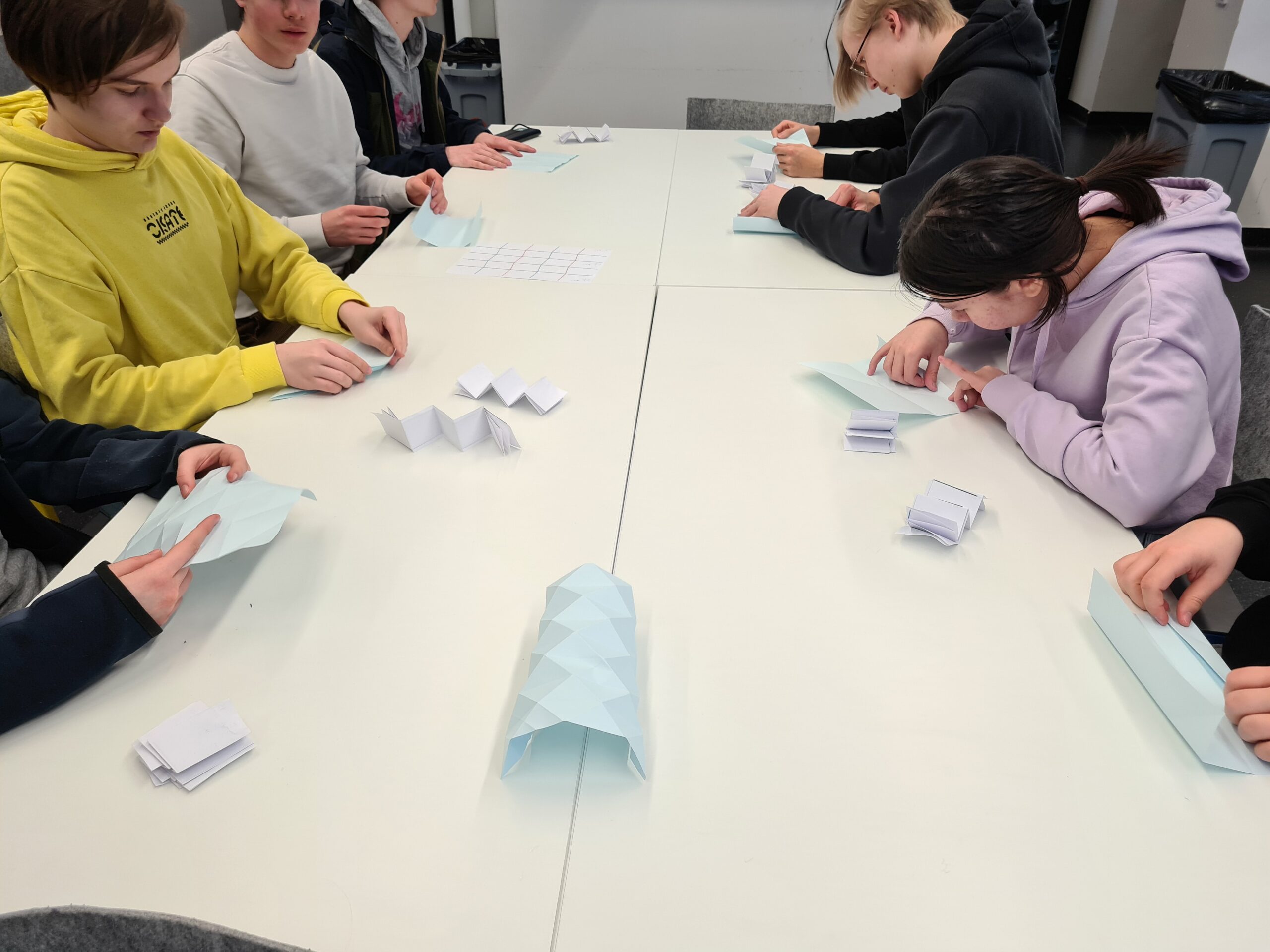 TT-linjan opintojakso ”Matematiikkaharrastajat” vieraili Aalto yliopiston Junior -työpajassa tutustumassa yllättävään matematiikan sovellukseen: origamitaitteluun! Origami (taitettu paperi) on satoja vuosia vanha japanilainen taiteenlaji, mutta työpajassa opittiin, että esimerkiksi vasemmalla olevaa Miura-origamikuviota hyödynnetään helpon kasattavuuden vuoksi avaruussatelliittien aurinkopaneeleissa. Samoin oikealla olevaa Yoshimura-kuviota käytetään mm. antenneissa, sylinteristen kokoontaitettavien rakenteiden muodostamisessa ja pinnan energian absorboinnissa.