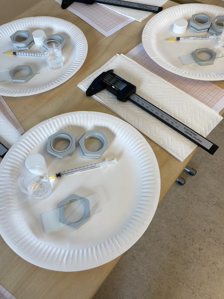 Kokeellinen tehtävä, jossa vesipisaran muotoa tutkittiin fokusoimalla sen kuva paperilautaselle.