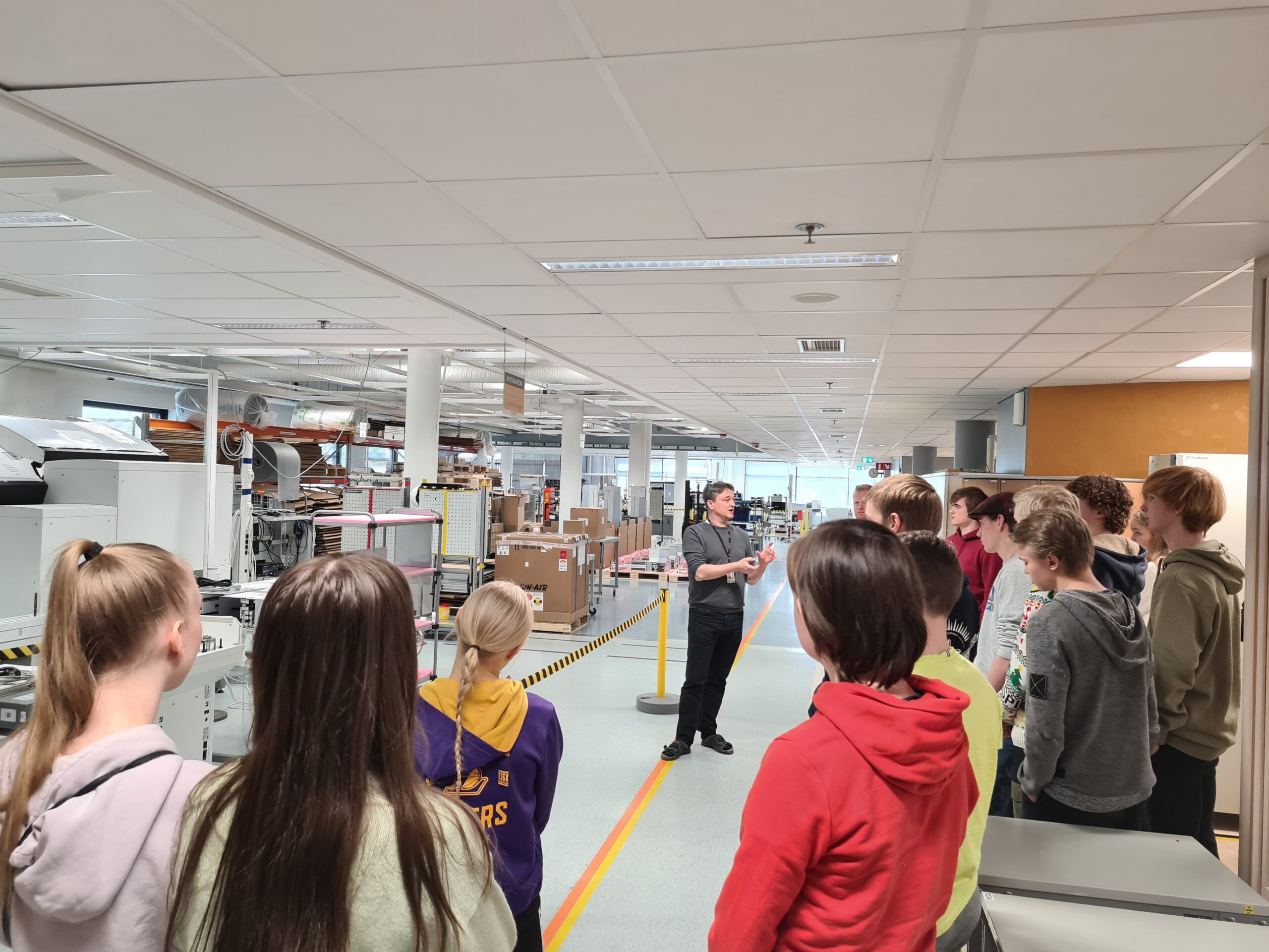 Esittelyn (ja vappumunkkien!) jälkeen vuorossa oli tutustuminen yrityksen tuotantolinjoihin. Tässä näkyi hyvin jättimäisen yrityksen taustaresurssit: kaikki on suunniteltu viimeisen päälle fiksusti, jolloin herkkien laitteiden valmistaminen onnistuu sujuvasti ja kaikkia turvallisuusstandardeja noudattaen. Samalla muutama linjaston henkilö kertoi TT-linjalaisille työstään, ja olikin mukavaa nähdä, miten monipuolisia ja erilaisilla koulutustaustoilla mahdollisia työtehtäviä yrityksessä löytyi.