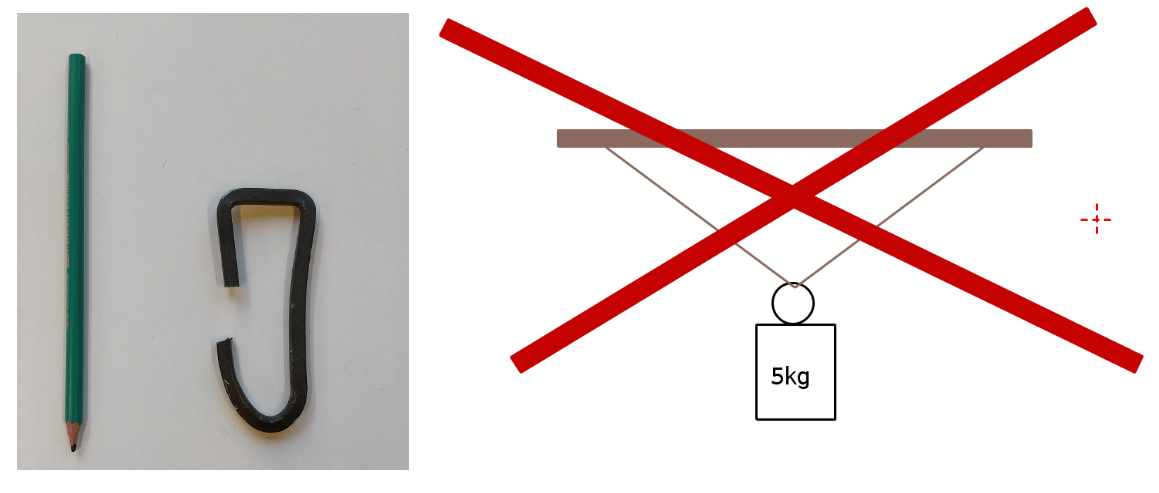 - Testipunnukset ripustetaan erikseen toimitettavaan koukkuun (vasen kuva). HUOM! Koukku asetetaan sillan “kävelytasolle” eikä esimerkiksi sillan alapuolelle, kuten oikeanpuoleisessa kuvassa.