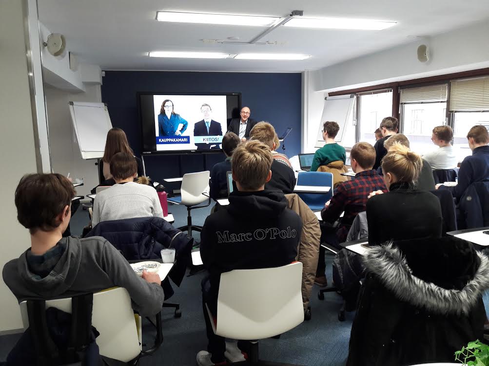 YT-linjan kurssilaiset vierailivat Helsingin Kauppakamarin vieraina. Kauppakamarin koulutusjohtaja Marko Silenesitteli vaikuttamistoimintaa sekä jäsenpalveluita. Kauppakamarin tehtävänä on vaikuttaa sekä paikallisesti että valtakunnallisesti päättäjiin, jotta yhteiskunta huomioisi kaikilla tasoilla yritysten tarpeet. Erityisen ajankohtaisena Silen piti Uudenmaan kehittämistä ja koulutuspolitiikan kohdentamista yritysten tarvitsemaan osaamiseen. Muita tärkeitä kysymyksiä Kauppakamarille ovat mm. infrastruktuurin taso, kannustava verotus sekä yritystoiminnan säätelyn mielekkyys. Kauppakamari tarjoaa jäsentensä käyttöön laajoja asiantuntija- ja koulutuspalveluita. Etujärjestötoiminta tuli tutuksi ja Kauppakamarin historiaan liittyviin merirosvous-aiheisiin kysymyksiin saatiin vastaukset. Kiitämme Kauppakamaria antoisasta vierailusta!