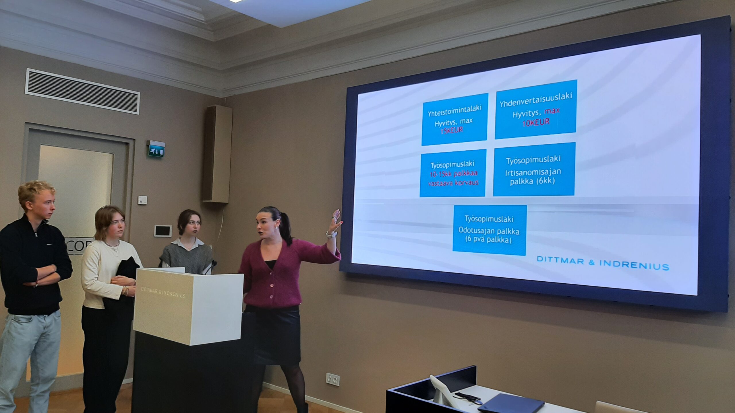 Marraskuun alussa opiskelijat pääsivät ratkomaan työoikeudellisia riitoja Dittmar & Indreniuksen juristien työpajassa. Ammattilaiset tenttasivat perusteluja opiskelijoiden ratkaisuihin työoikeudellisessa ongelmassa. Työoikeudesta ja oikeusopista tarttui mukaan useita mielenkiintoisia ja hyödyllisiä oppeja.