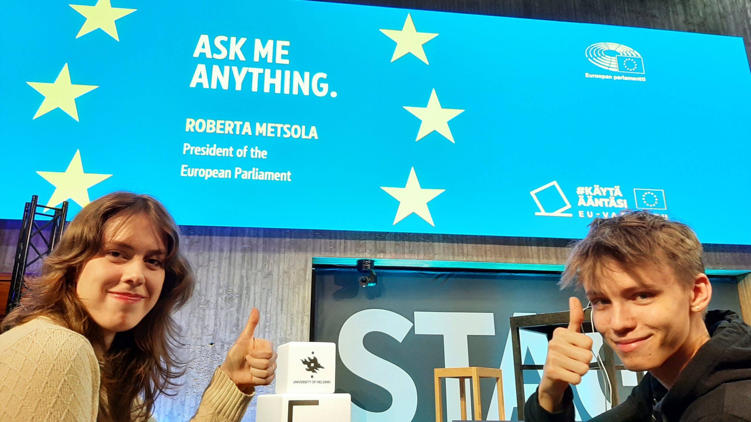 KSYK:n MEP-delegaatit Iida Keskinarkaus ja Juho Pekkanen osallistuivat HY:n Tiedekulman tilaisuuteen, jossa saattoi esittää kysymyksiä Roberta Metsolalle.