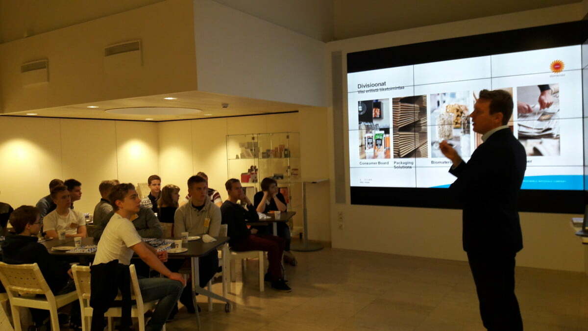 Yritystalouden kurssi sai tiukan ja asiantuntevan perehdytyksen globaaliin metsäteollisuuteen vieraillessaan myyntijohtaja Mikko Antsalon vieraana Stora-Enson pääkonttorilla. Kurssilaisille valkeni niin globaalin yhtiön liiketoimintalogiikka kuin metsäteollisuuden merkitys Suomen kansantaloudelle. Puun kaltaisen uusiutuvan luonnonvaran hyödyntäminen on suuri tulevaisuuden mahdollisuus ei vain yritykselle itselleen ja Suomen kansantaloudelle vaan torjuntakeinona ilmastonmuutokselle ja uusiutumattomien luonnonvarojen ehtymiselle. Paperikoulu oli myös bisneskoulu ja opiskelijoille selvisi käytännön esimerkkien kautta miten myyntityötä käytännössä tehdään. Ei siis ihme, että vierailua pidettiin erityisen mielenkiintoisena. Tästä suuret kiitokset Stora-Ensolle ja erityisesti Mikolle yksityiskohtaisesta ja käytännönläheisestä esityksestä.